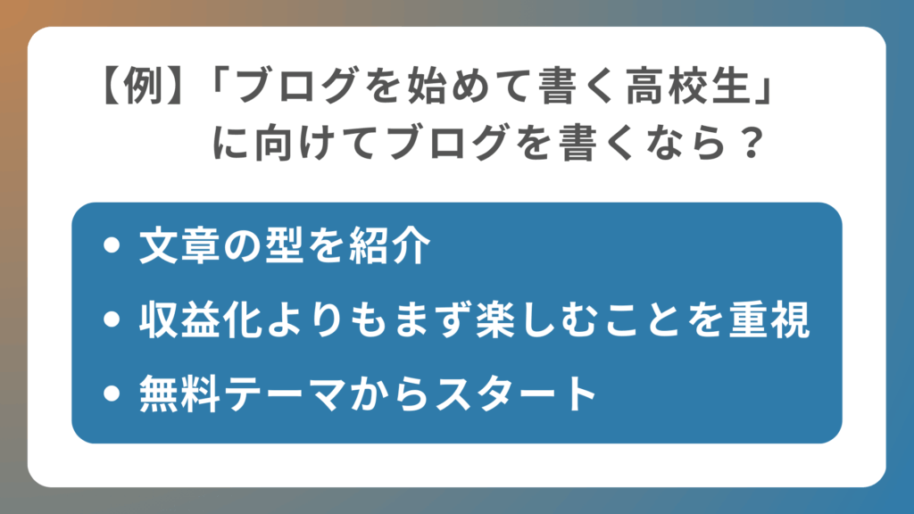 具体的な読者像を「ペルソナ」といい、ペルソナが決まると、言葉遣いが決まったり、例え話も合わせやすくなります。